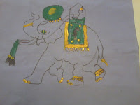 Our last project was a fabric painting of an ancient Indian elephant with a lot of gold trim. Because I wanted them to concentrate on drawing the details on the elephant and painting it, the pattern was on their fabric.